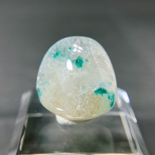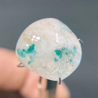 こちらのカボションは、フリーフォームシェイプで、水晶の中にダイオプテーズが散っていて、中には結晶体の形が見て取れるものもあります。