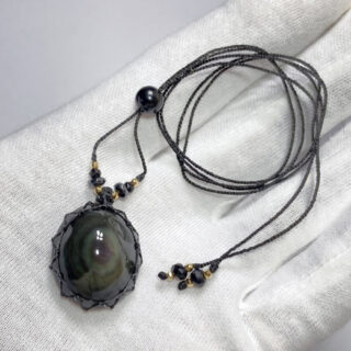 艶のあるブラックの中で、層になった七色のパートが重なり合ったり、単色で色を帯びていたりするレインボーオブシディアン。
